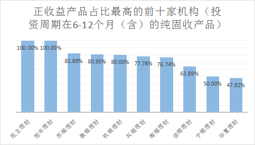 从正收益产品来看,苏银理财正收益产品数量最多,为104只;信银理财、兴银理财正收益产品分别有92只、56只,数量位列二三。从正收益产品占比来看,民生理财和恒丰理财2家理财公司产品实现100%月月正收益,其他机构正收益产品占比均未超过90%,苏银理财、徽银理财和杭银理财正收益比例达80%。