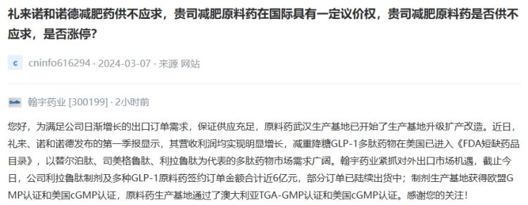 5月2日,翰宇药业[300199]在互动平台表示,为满足公司日渐增长的出口订单需求,保证供应充足,原料药武汉生产基地已开始了生产基地升级扩产改造。近日,礼来、诺和诺德发布的第一季报显示,其营收利润均实现明显增长,减重降糖GLP-1多肽药物在美国已进入《FDA短缺药品目录》,以替尔泊肽、司美格鲁肽、利拉鲁肽为代表的多肽药物市场需求广阔。翰宇药业紧抓对外出口市场机遇,截止今日,公司利拉鲁肽制剂及多种GLP-1原料药签约订单金额合计近6亿元,部分订单已陆续出货中;制剂生产基地获得欧盟GMP认证和美国cGMP认证,原料药生产基地通过了澳大利亚TGA-GMP认证和美国cGMP认证。