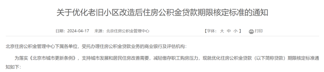 4月17日,北京住房公积金管理中心发布了《关于优化老旧小区改造后住房公积金贷款期限核定标准的通知》。