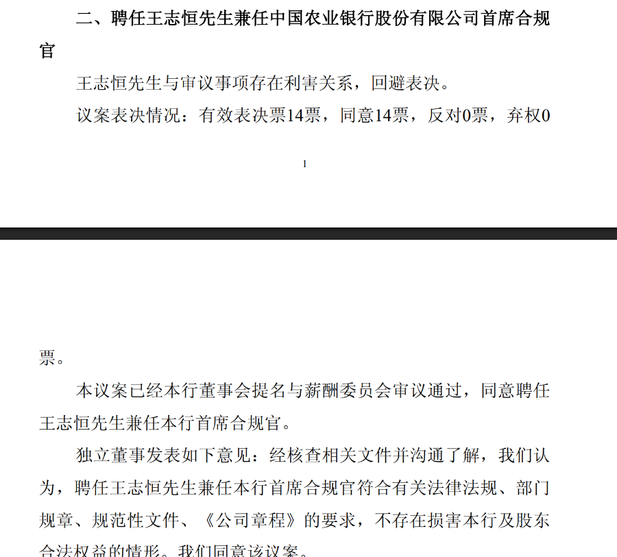 2026年开春,农业银行与中国银行相继发布公告,分别由行长王志恒、张辉兼任本行首席合规官。此次系两家银行首次设立首席合规官职位,且均由总行行长亲自兼任,被业内认为“高配”,反映出国有大行对合规内控的重视。